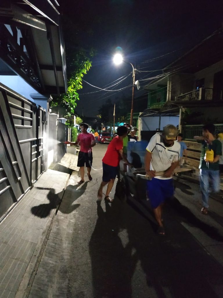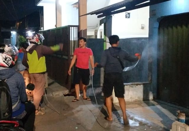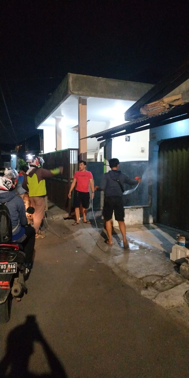 MAGAZINE INDONESIA – Jakarta – (04/04/2020) themagnesianews.com || Para pemuda Kampung Kresek Kelurahan Duri Kosambi Cengkareng Jakarta Barat, bergotong royong melaksanakan penyemprotan disenfektan guna mencegah penyebaran covid – 19 di wilayah RT. 001 – 002 RW. 012.
