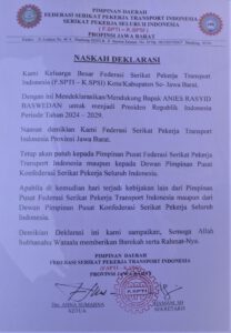 MAGAZIN INDONESIA-Bandung. Federasi Serikat Pekerja Transformasi Indonesia, Konfederasi Serikat Pekerja Seluruh Indonesia (F.SPTI-K.SPSI) gelar deklarasi untuk mendukung dan memilih Anis Rasyid Baswedan sebagai Presiden Republik Indonesia 2024-2029.