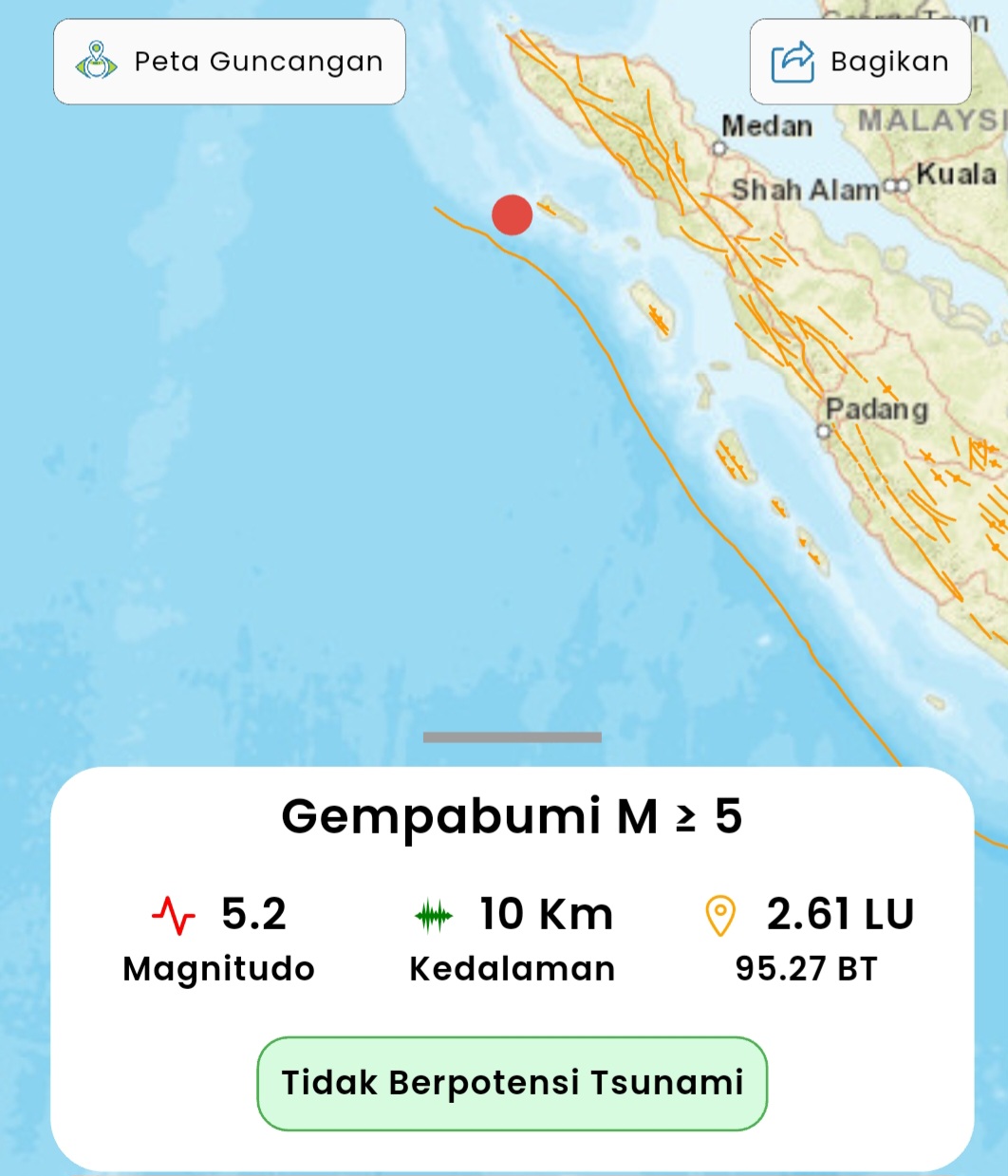 Gempa Magnitudo 5,2 Guncang Barat Laut Sinabang, Aceh Pagi Ini