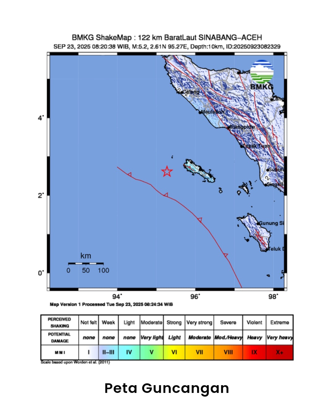MAGAZINE INDONESIA-Aceh, 23 September 2025 – Badan Meteorologi, Klimatologi, dan Geofisika (BMKG) melaporkan terjadinya gempa bumi tektonik dengan kekuatan Magnitudo 5,2 yang mengguncang wilayah 122 km Barat Laut Sinabang, Aceh, pada Selasa (23/9) pukul 08:20:38 WIB.