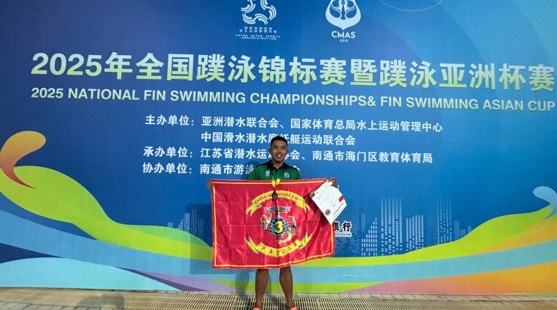 MAGAZINE INDONESIA-TNI AL, Dispen Kormar Sorong. Atlet renang Pasmar 3 kembali mengharumkan nama bangsa di kancah internasional. Pada ajang Asian CUP Fin Swimming Indoor Nantong CMAS 2025 yang berlangsung di Haimen District Sports Center, Nantong, Cina, Minggu (21/9/2025), prajurit Resimen Artileri (Menart) 3 Marinir, Serda Jas Farel Nandana Putra, sukses meraih medali Juara 2.