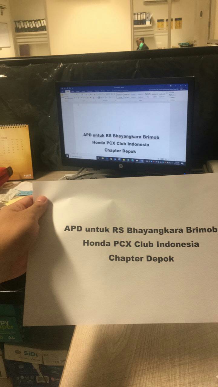 Melihat kondisi yang demikian, HPCI (Honda PCX Club Indonesia) Chapter Depok, yang diketuai Payogo, merasa terpanggil dan peduli dengan para petugas medis yang rela mengorbankan diri untuk kesembuhan para pasien, bentuk apresiasi seluruh member HPCI Chapter Depok pada hari ini (13/04) (16:00) memberikan 20 pcs alat APD kepada Rumah Sakit Bhayangkara Brimob di Jln Komjen.Pol M. Yasin Cimanggis Depok JawaBarat.