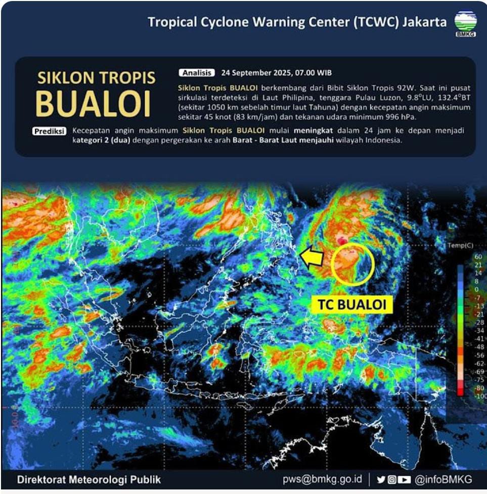 MAGAZINE INDONESIA- Jakarta, Rabu, 24 September 2025 – Badan Meteorologi, Klimatologi, dan Geofisika (BMKG) melaporkan perkembangan terbaru mengenai Siklon Tropis BUALOI yang saat ini terpantau di Laut Filipina, tepatnya di tenggara Pulau Luzon. Fenomena ini mendapat perhatian khusus karena diperkirakan akan mengalami peningkatan intensitas dalam 24 jam ke depan.