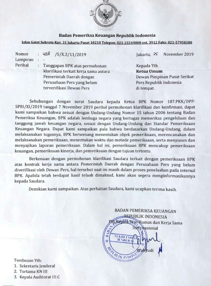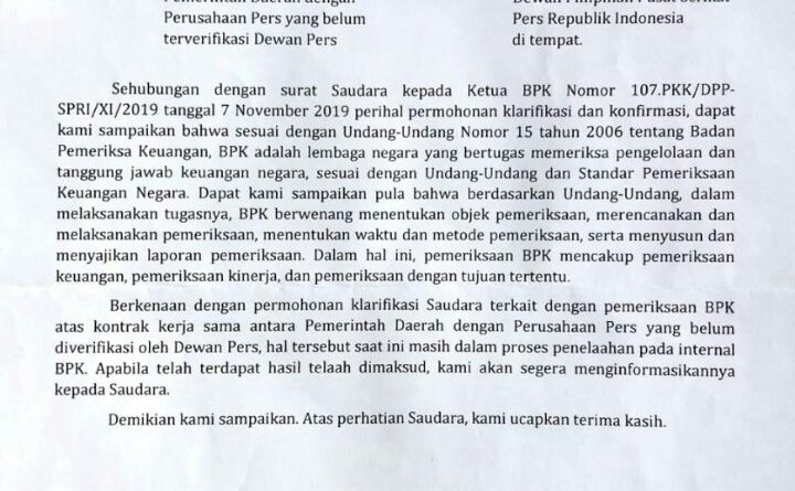 BPK RI akhirnya menjawab surat SPRI tersebut melalui suratnya nomor : 438/S/X.2/11/2019 tangal 25 Noveber 2019, tentang Tanggapan BPK atas permohonan klarifikasi terkait kerja sama antara pemerintah daerah dengan perusahaan pers yang belum diverifikasi Dewan Pers.