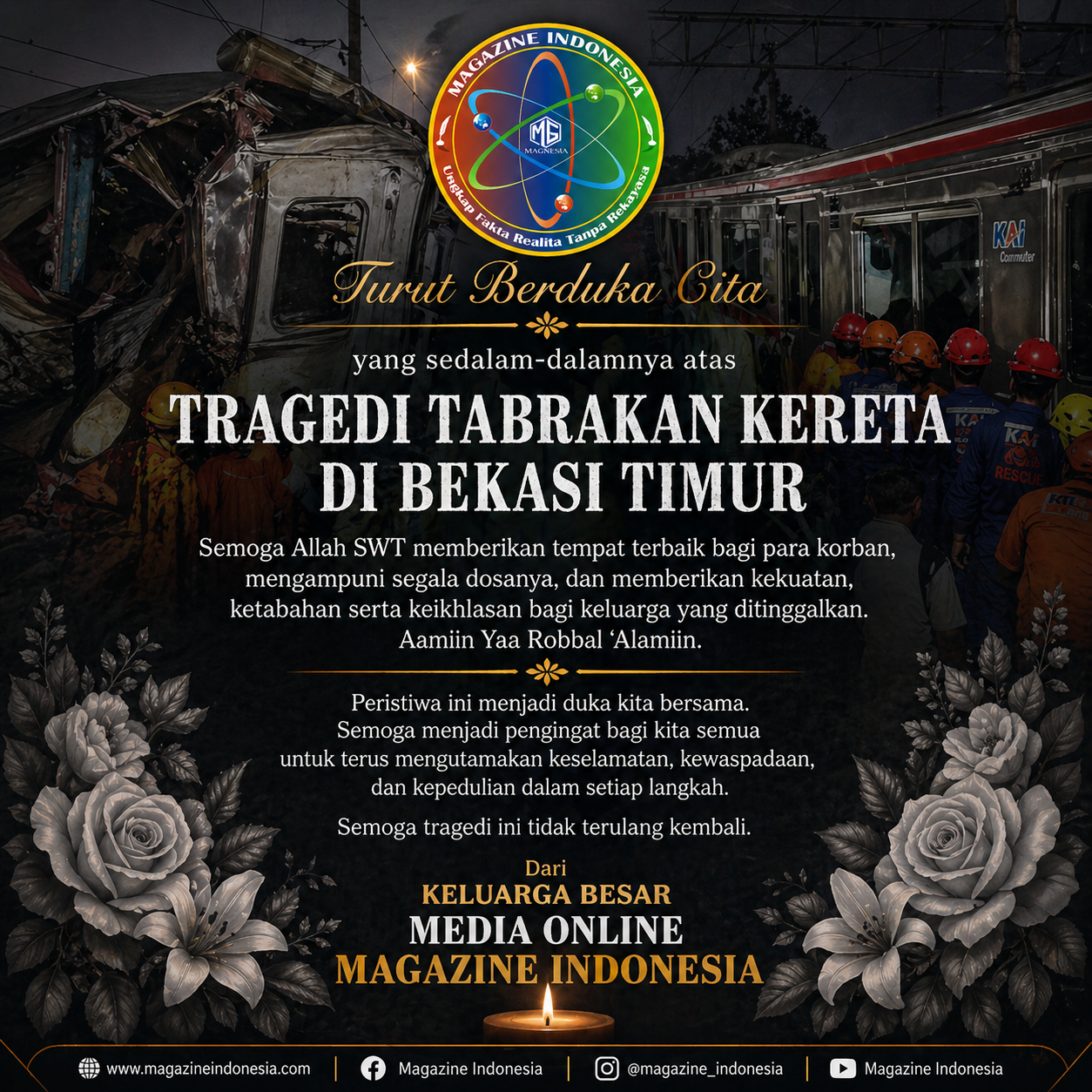 Keluarga Besar Media Online Magazine Indonesia menyampaikan turut berduka cita yang sedalam-dalamnya atas tragedi ini. Semoga para korban mendapatkan tempat terbaik di sisi Tuhan Yang Maha Esa, serta keluarga yang ditinggalkan diberikan kekuatan dan ketabahan.
